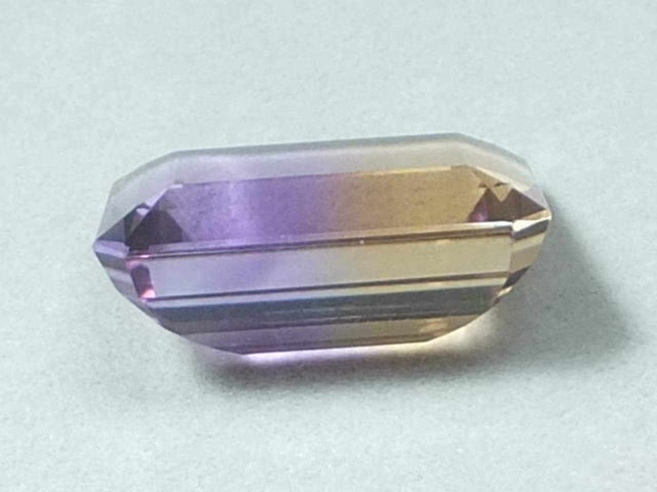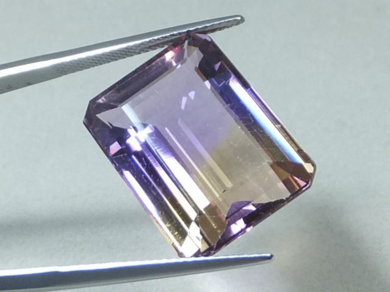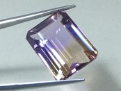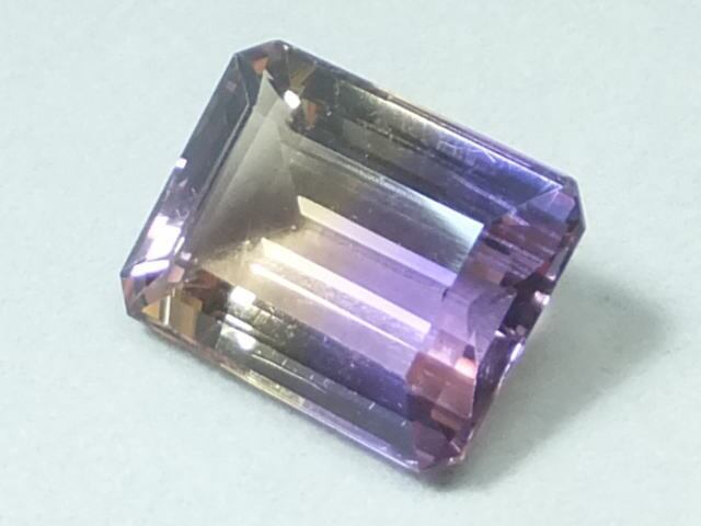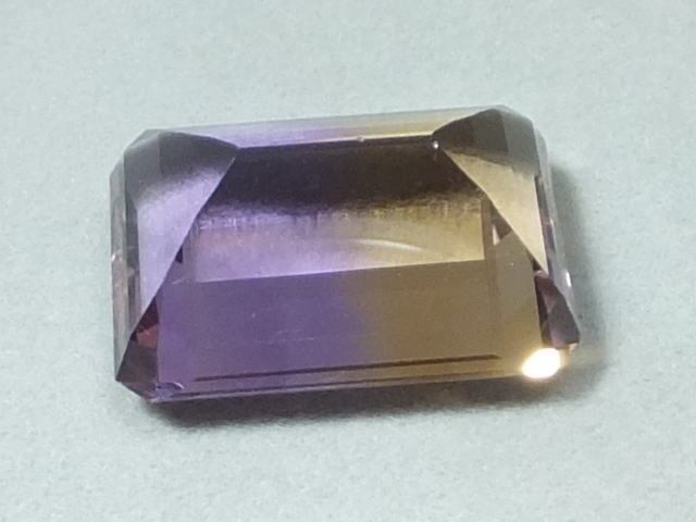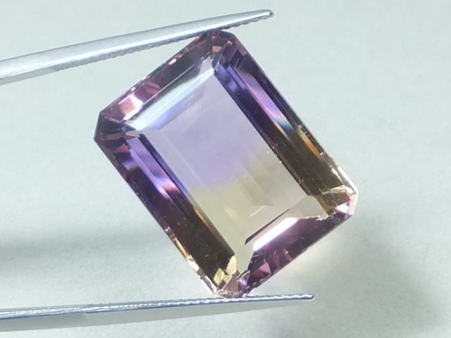 アメシストとシトリンのバイカラーになったものがアメトリンと呼ばれています。当該石パビリオンからのライトリターンが良い大きな結晶です。
